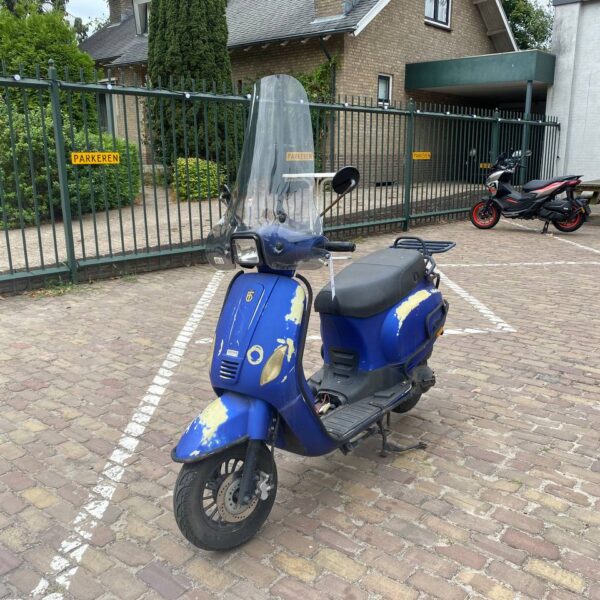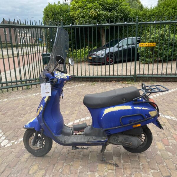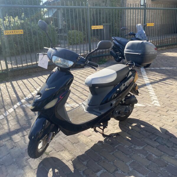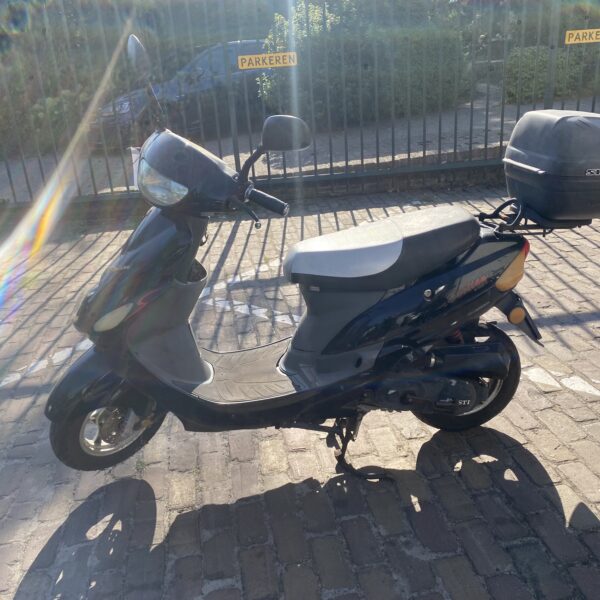 Opvallende rode Aprilia SXR bromscooter uit juni 2023. Deze Aprilia SXR 50 is voorzien van een topkofferdrager met daarop een