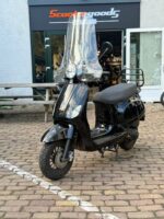 Deze scooter is voorzien van een hoog windscherm en een klapdrager achter.