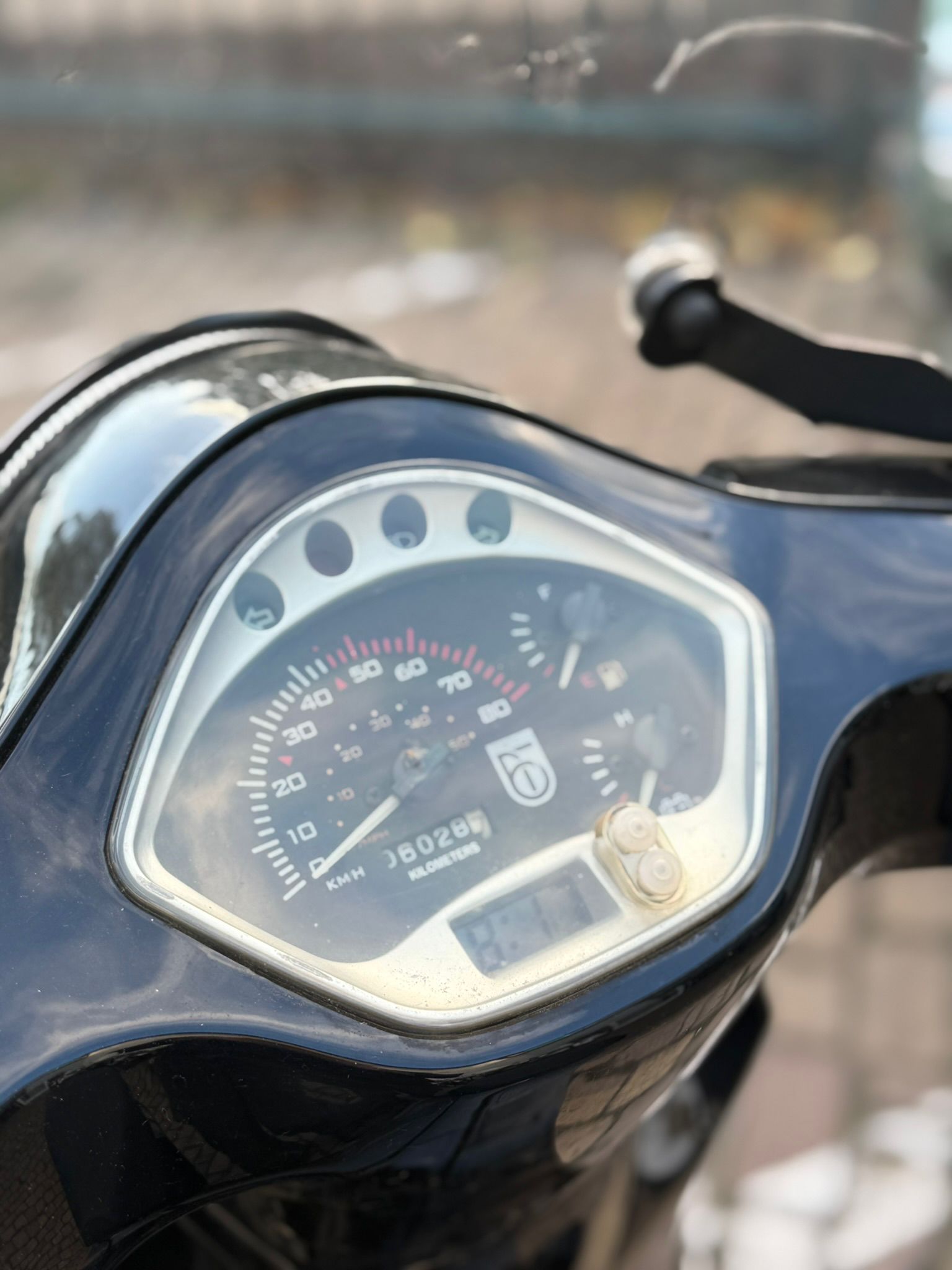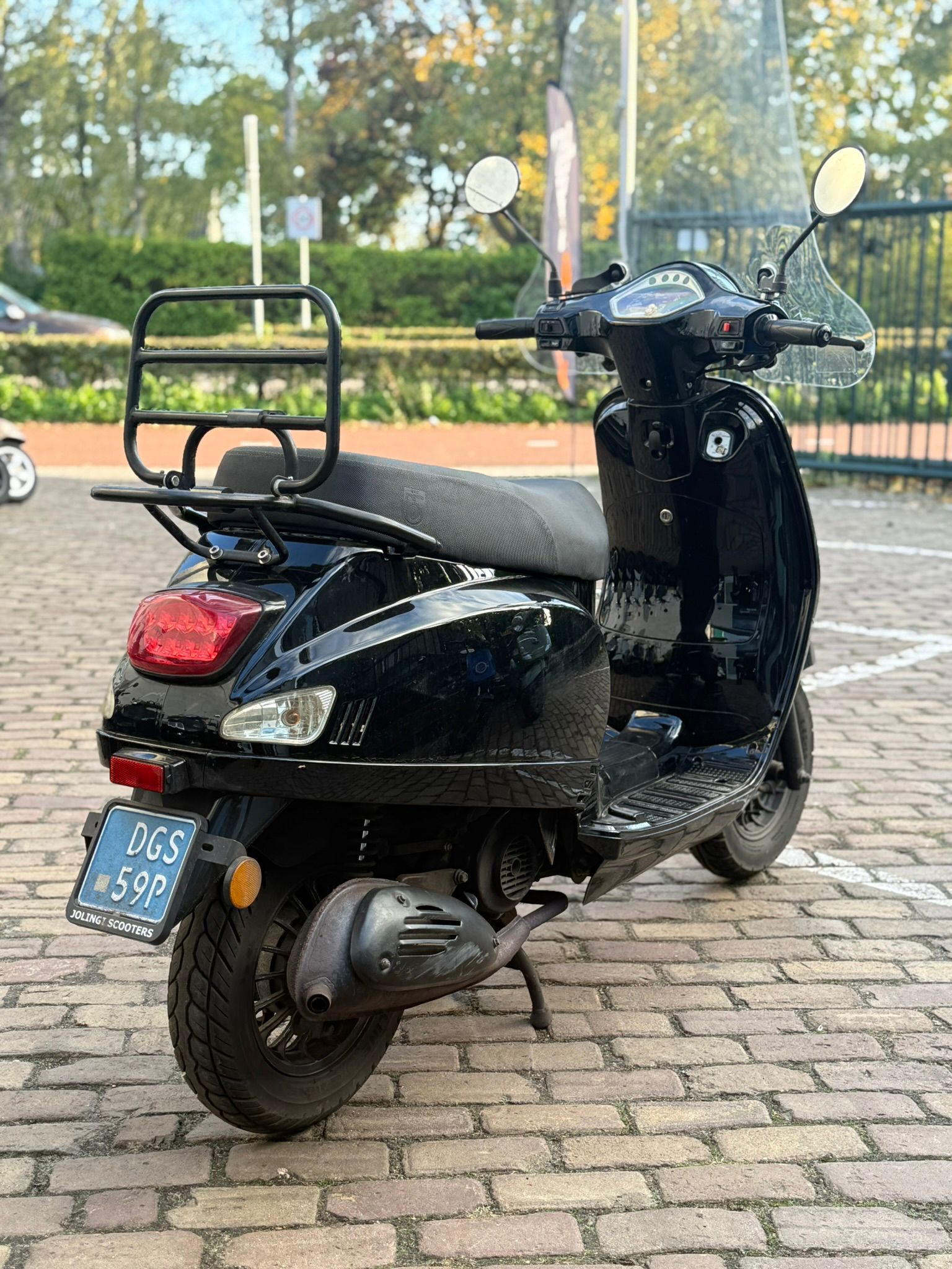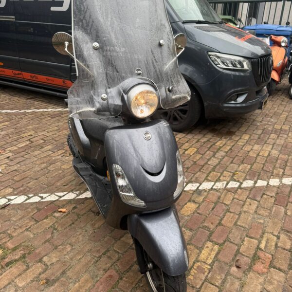 Deze scooter is voorzien van een hoog windscherm en een klapdrager achter.