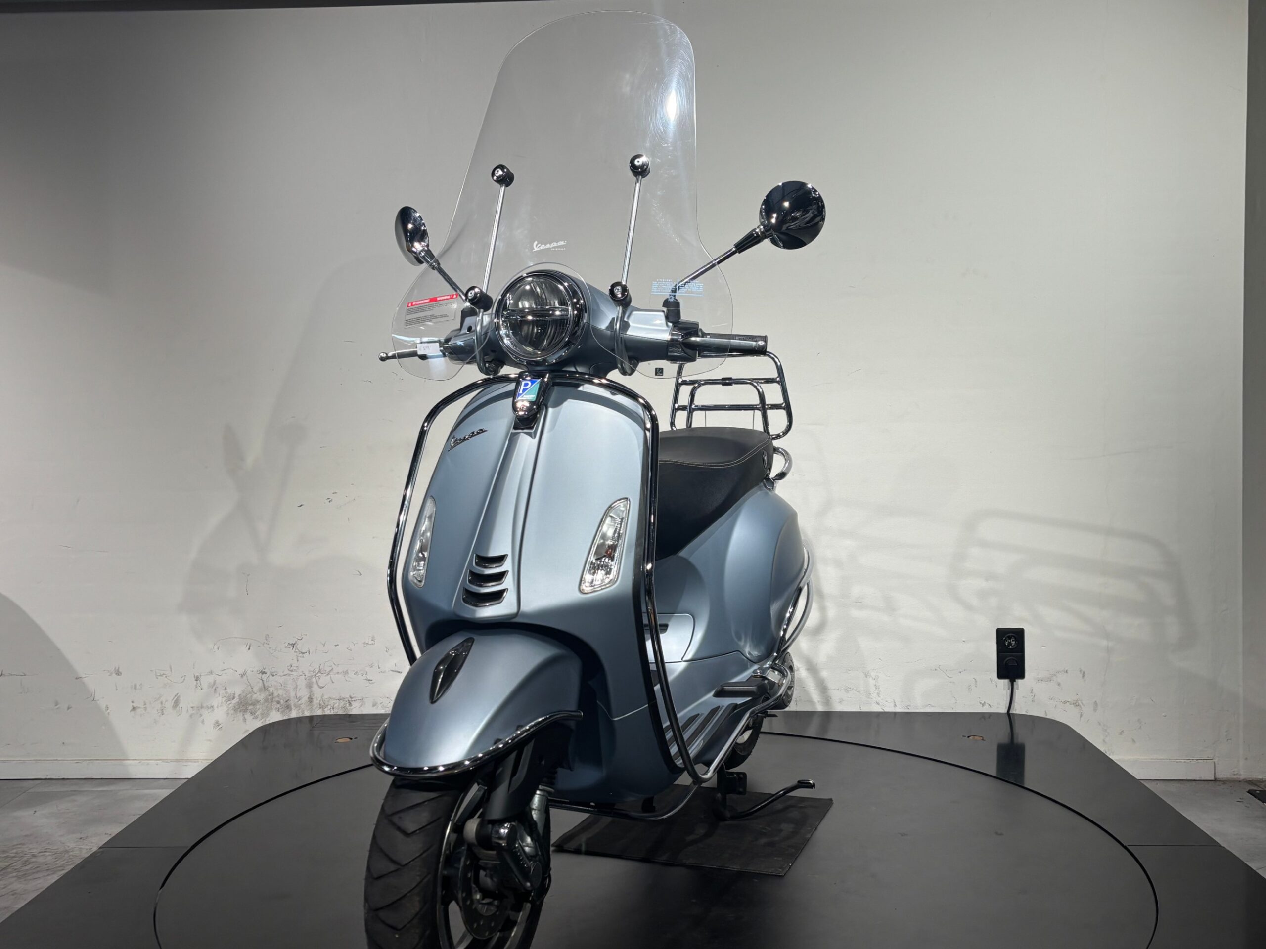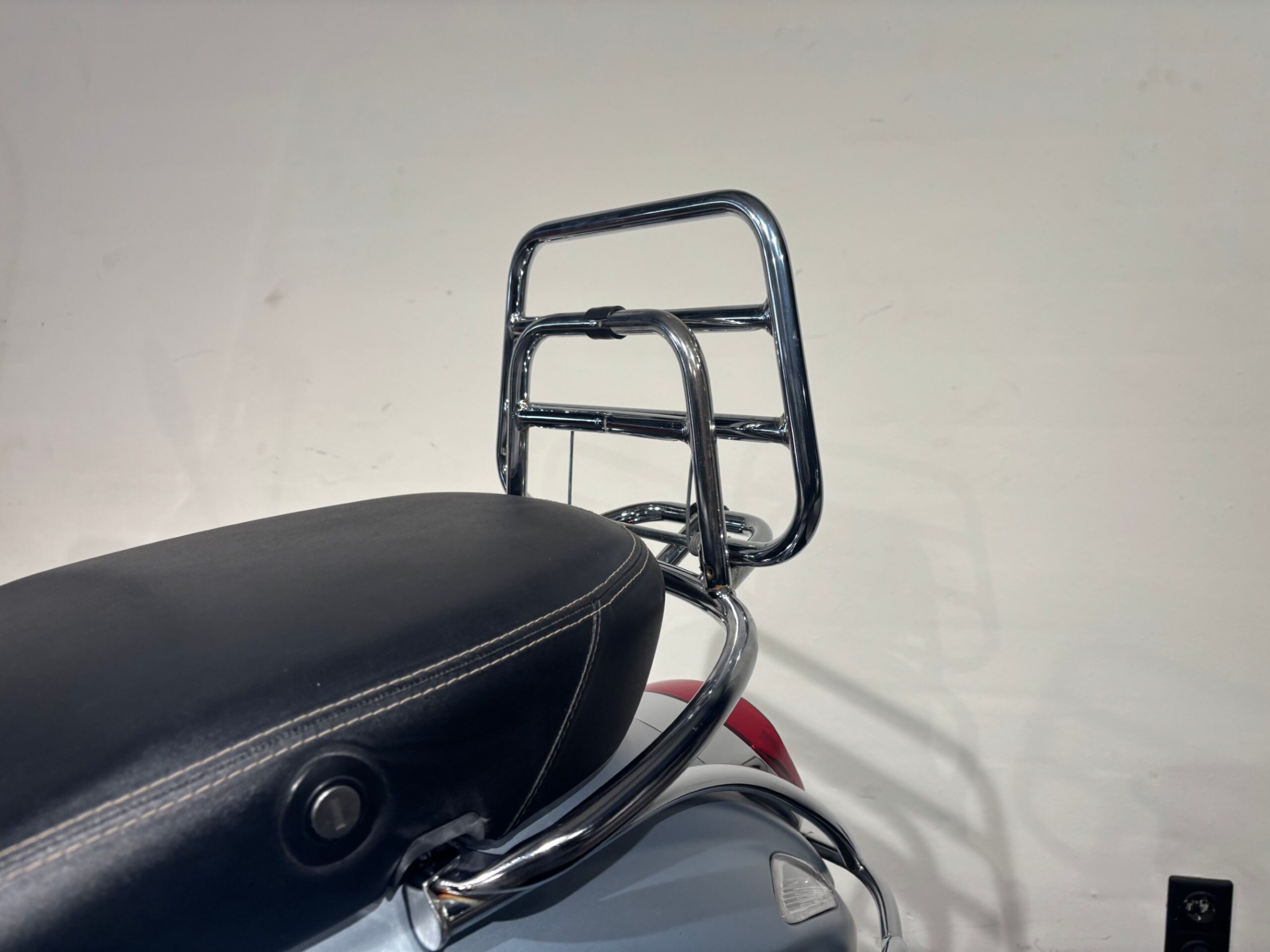 Deze Vespa is voorzien van sierbeugels voor en achter, een sierbeugel op het voorspatbord, een hoog windscherm en een klapdrager achter.